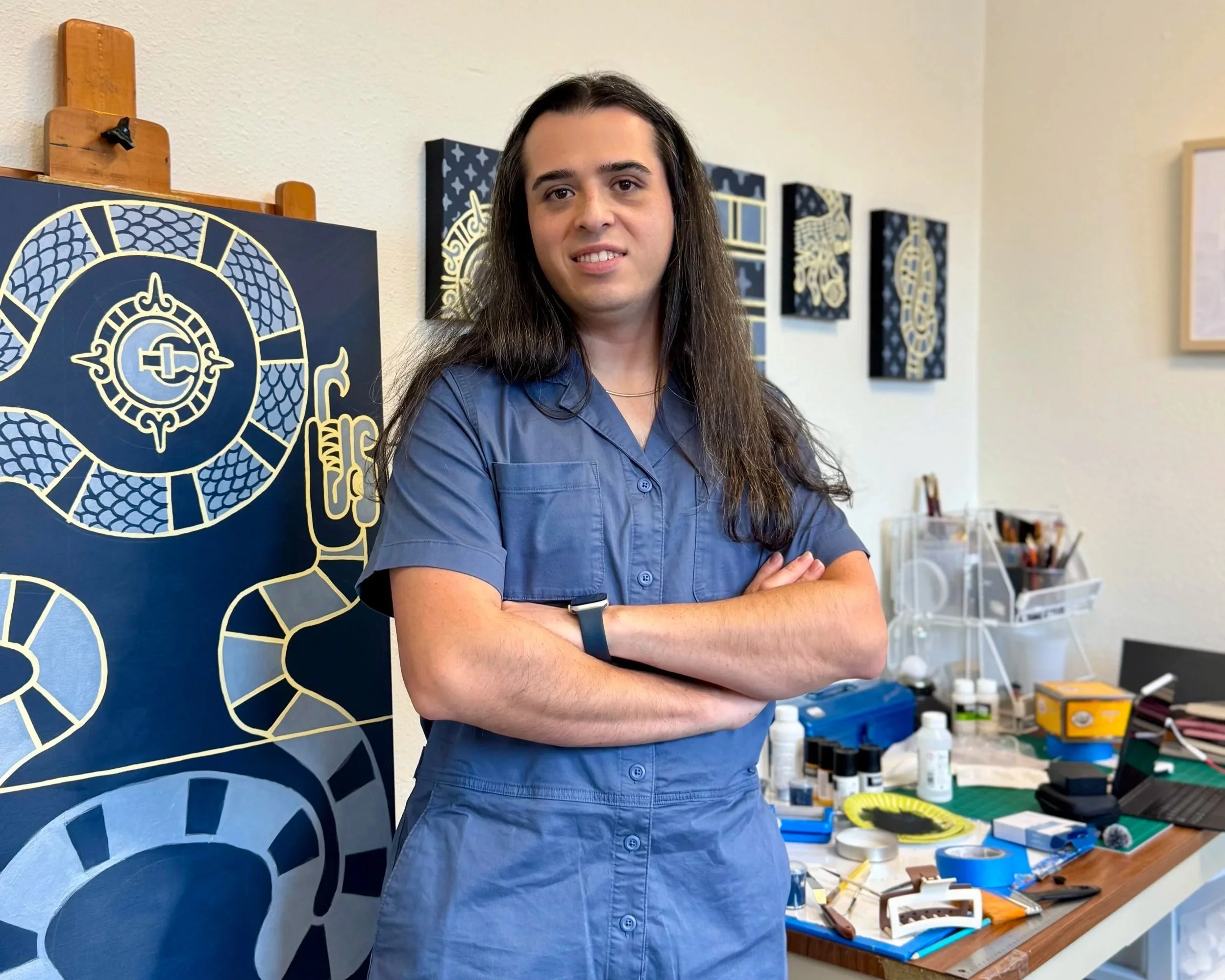 In my work I reflect on themes of displacement, identity, and connection by reinterpreting symbols from pre-colonial Mesoamerican codices and references to contemporary American politics and culture. This interpretive process is also characterized by the desire to understand the present moment within the larger context of American history.
